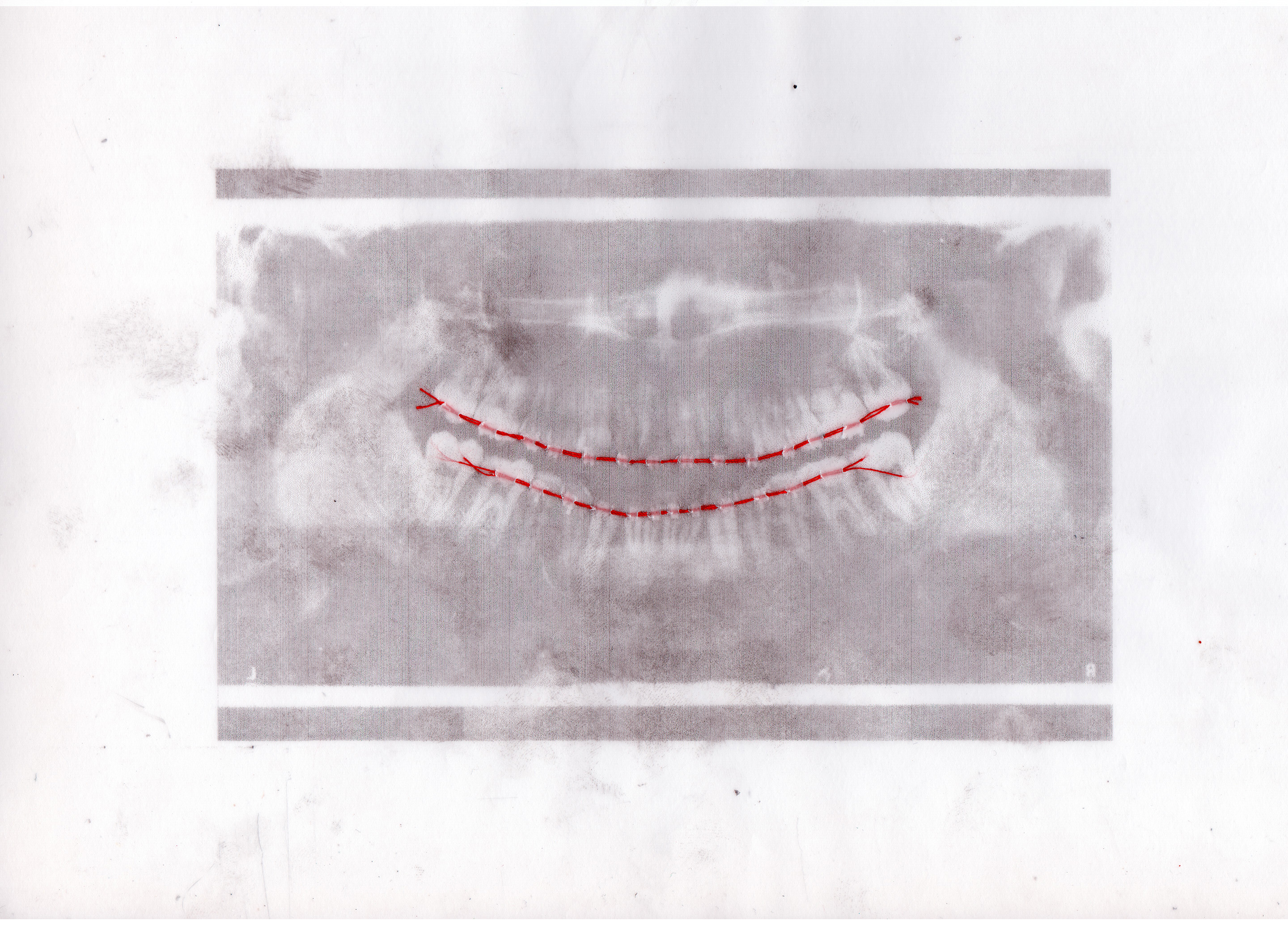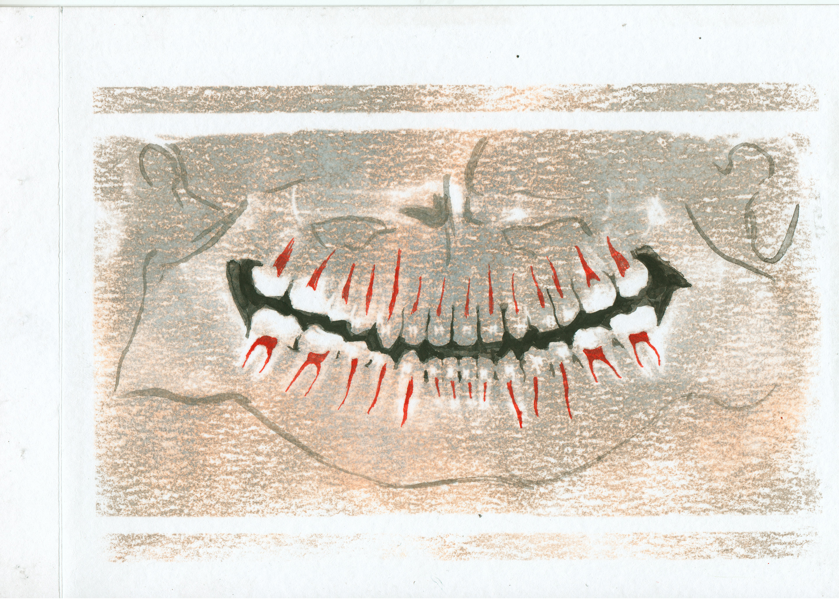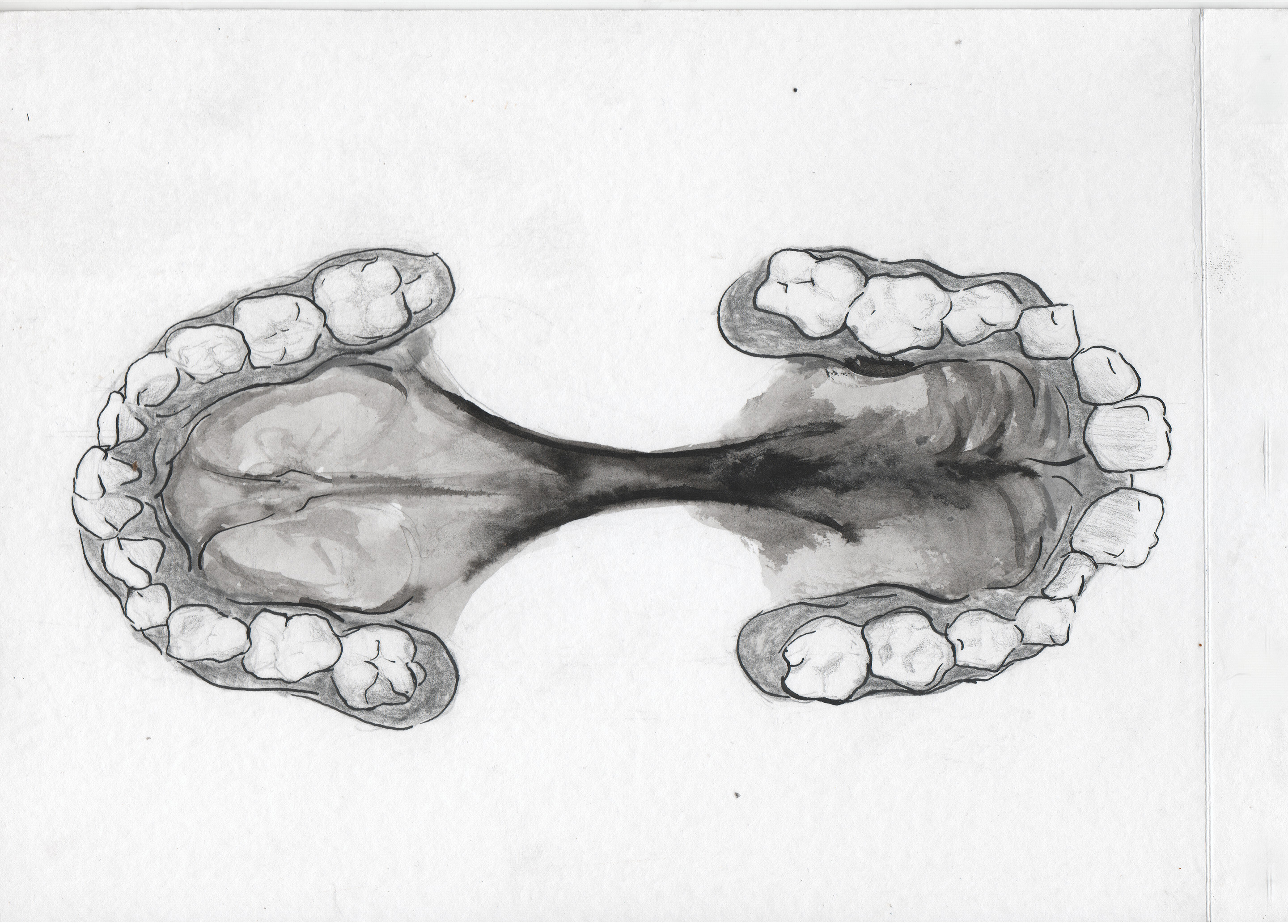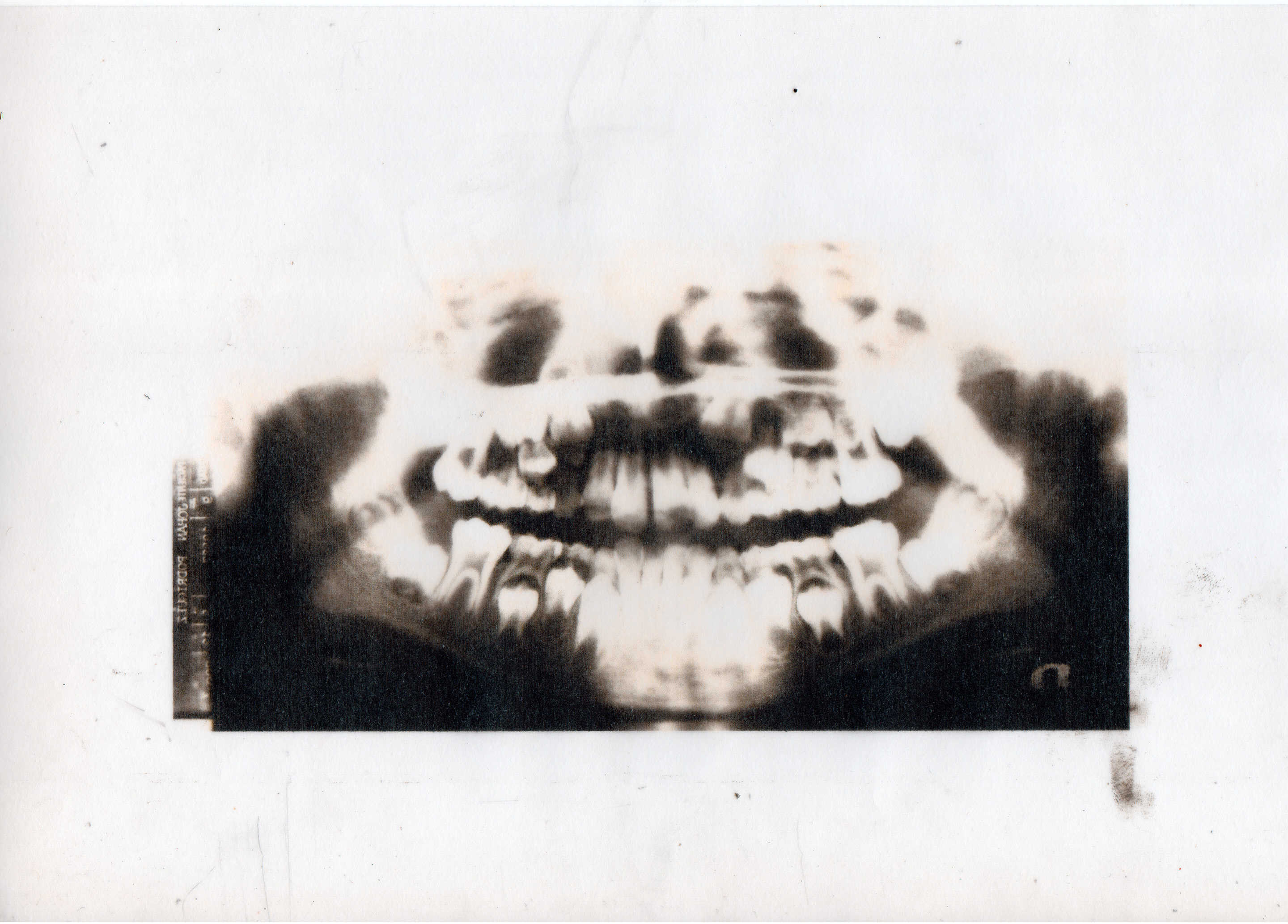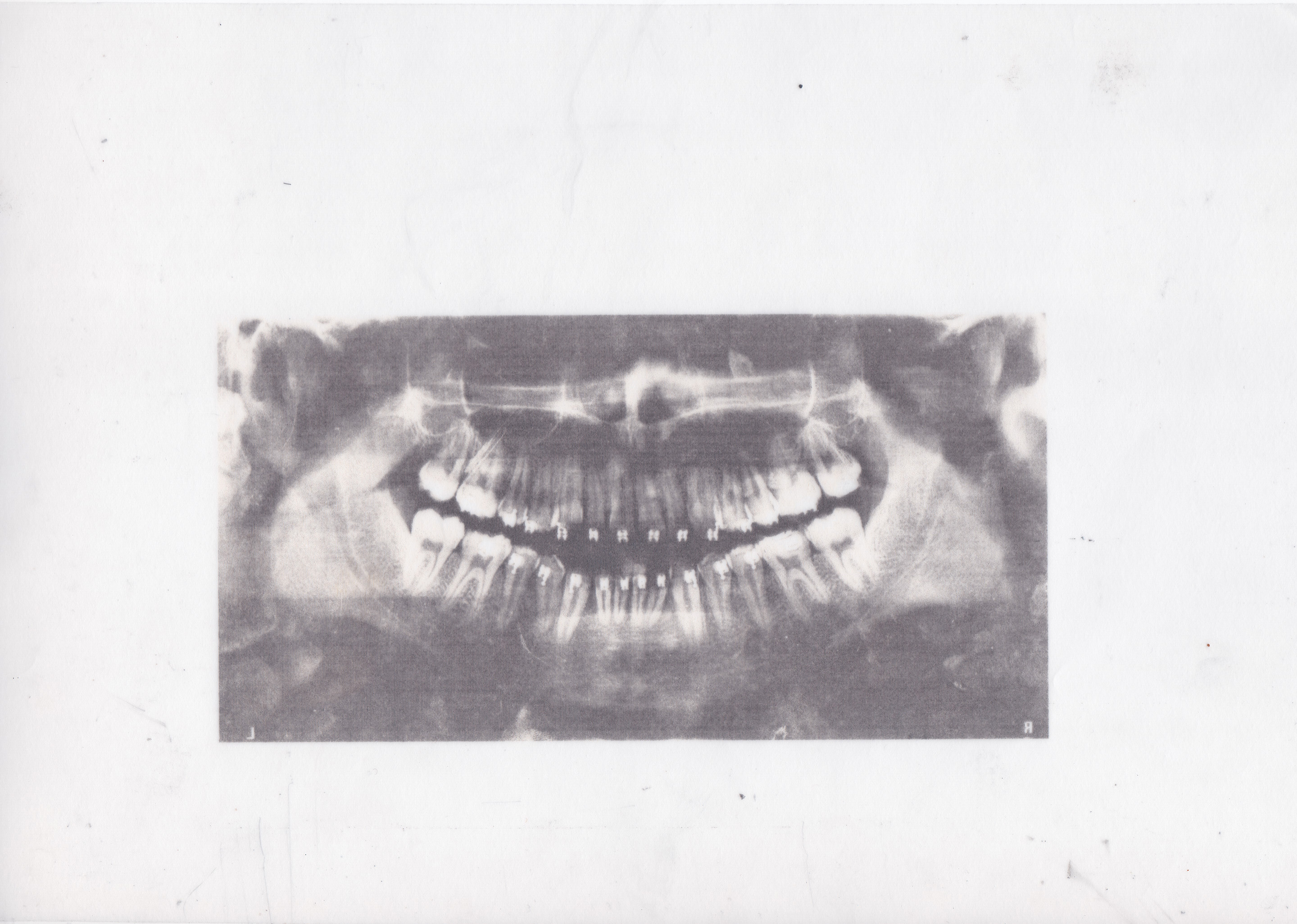 De dientes para afuera es una propuesta que indaga en las propiedades del dibujo como herramienta de estudio fisionómico a partir del autorretrato. Consiste en recorrido por dos momentos de mi vida -9 años y 18 años de edad-, observando modificaciones estructurales dentales que afectan la morfología de todo el rostro. Para este propósito se han utilizado radiografías y registros fotográficos provenientes del archivo clínico. Estas imágenes son editadas digitalmente, reproducidas y posteriormente intervenidas de manera analógica. De este modo, al estar mediado por la mirada subjetiva, el historial dental se convierte en material autobiográfico y registro de la memoria emocional para construir un libro de artista que opera como retrato.
